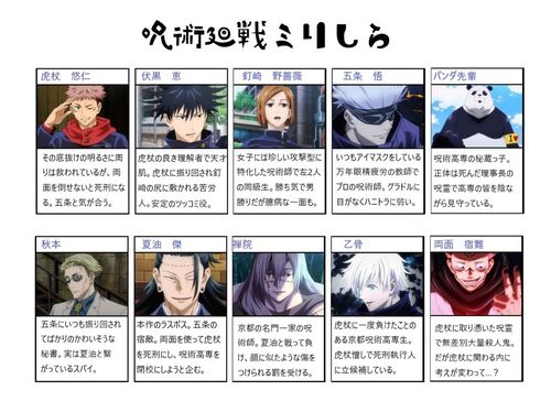 先月一瞬だけミリしら記入にはまっていたのでここに残しておく。 ミーハーではないので人気作品のタイトルは知っていても中身は知らないことがほとんど。 まずは呪術廻戦。キャラ名や用語を知っているレベル。これを書いた後に乙骨としていた白髪の人物がど…